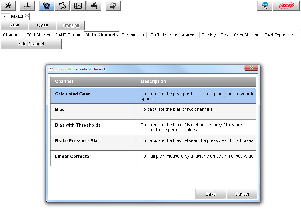 With AiM systems you immediately get Math Channels values: the dash logger can be configured to display those values (i.e. brake bias, calculated gear) in real time.